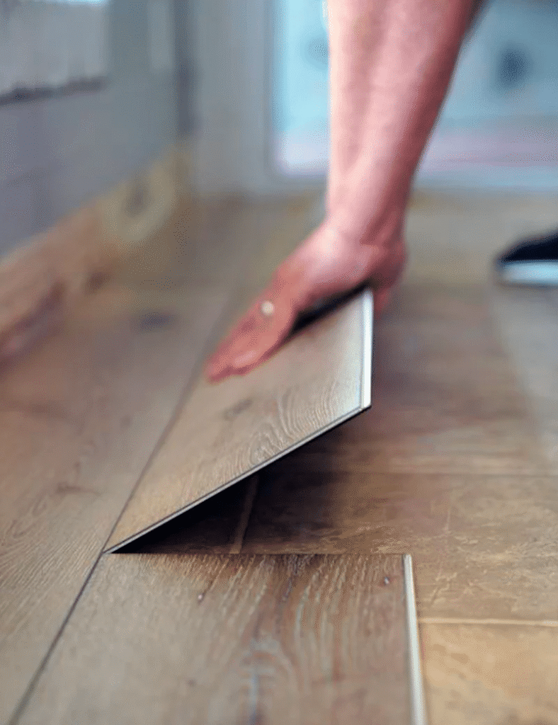 Ambiente moderno con piso vinílico SPC imitación madera instalado en sala de estar, ideal para hogares por su resistencia al agua y fácil mantenimiento.